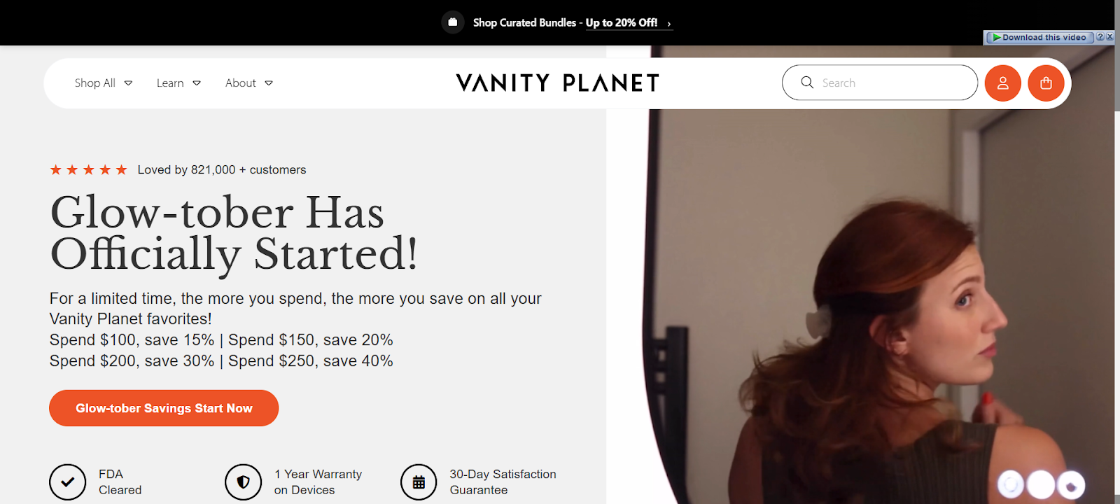 Vanity Planet embeds demo videos and step-by-step usage explanations. Product descriptions highlight features, benefits, and health/safety considerations. Bundles, subscriptions, and pricing options are clearly displayed. FAQs and customer reviews provide additional guidance. Navigation is intuitive with sticky CTAs.